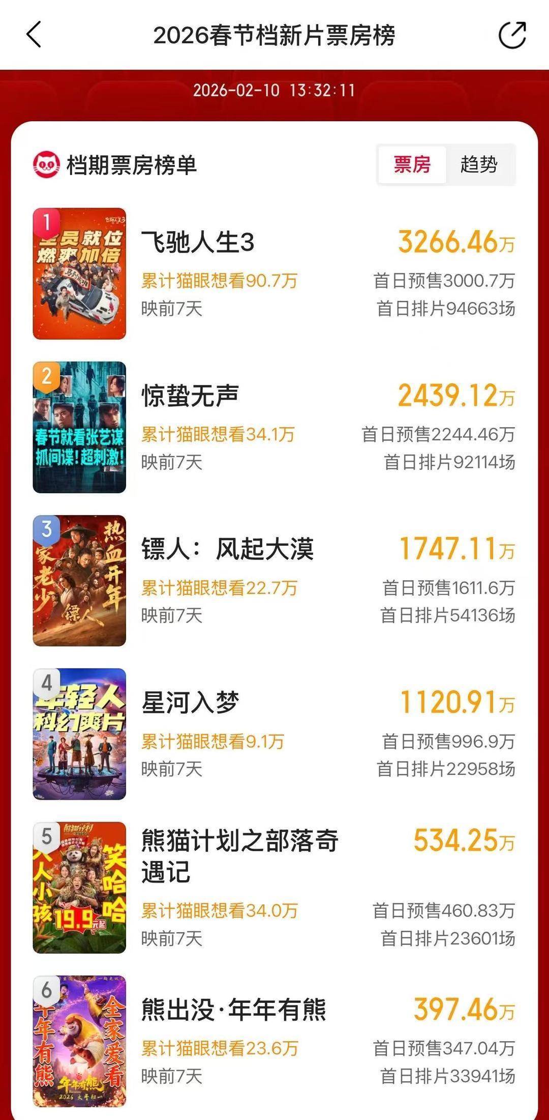 2月9日13点,春节档预售数据,图据猫眼专科版