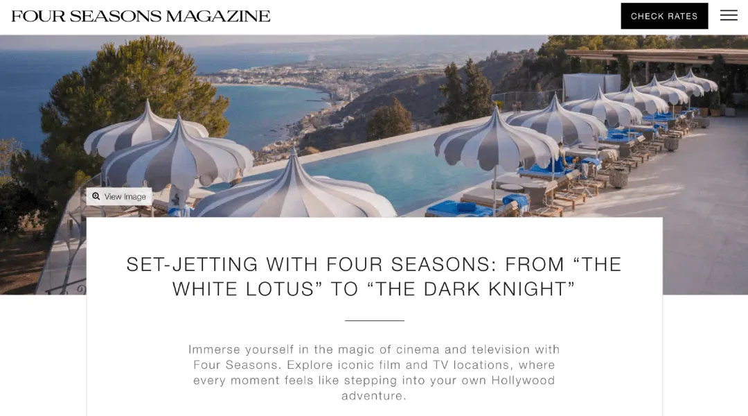 ● 四季旅社的杂志 Four Seasons Magazine 也激情地接待顾主们来取景地旅行(set-jetting)