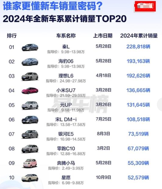 在当下竞争日益强烈的市集环境下,车企除了降价促销以外开yun体育网,积极鼓吹车型蜕故孳新亦然迫切计谋,近期易车网发布了2024年全新车系的累计销量名次榜,接下来咱们就来看哪家车企更懂新车的销量密码? NO.1 秦L 2024年累计销量:228818辆 排在榜单第一的是比亚迪于5月28日负责上市的秦L,新车24年累计销量达228818辆,手脚一款定位高于秦的新车型,整车在外不雅上保执了更为大气优雅的设想立场,同期升级后的能源系统也让整车在续航和经济性方面有出色的推崇。 NO.2 海豹06 202