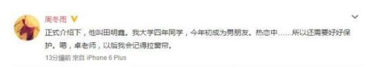 2015年,周冬雨被拍到与田明鑫约聚亲热的相片,登上了热搜。 随后她便主动官宣了这段恋情,并先容了两东谈主是同学。