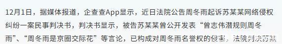 12月1日,周冬雨向法院告状责骂者苏某某一事经核查终于有了定论。 经法院判定,苏某某的言论如故组成了对周冬雨名誉权的侵害。