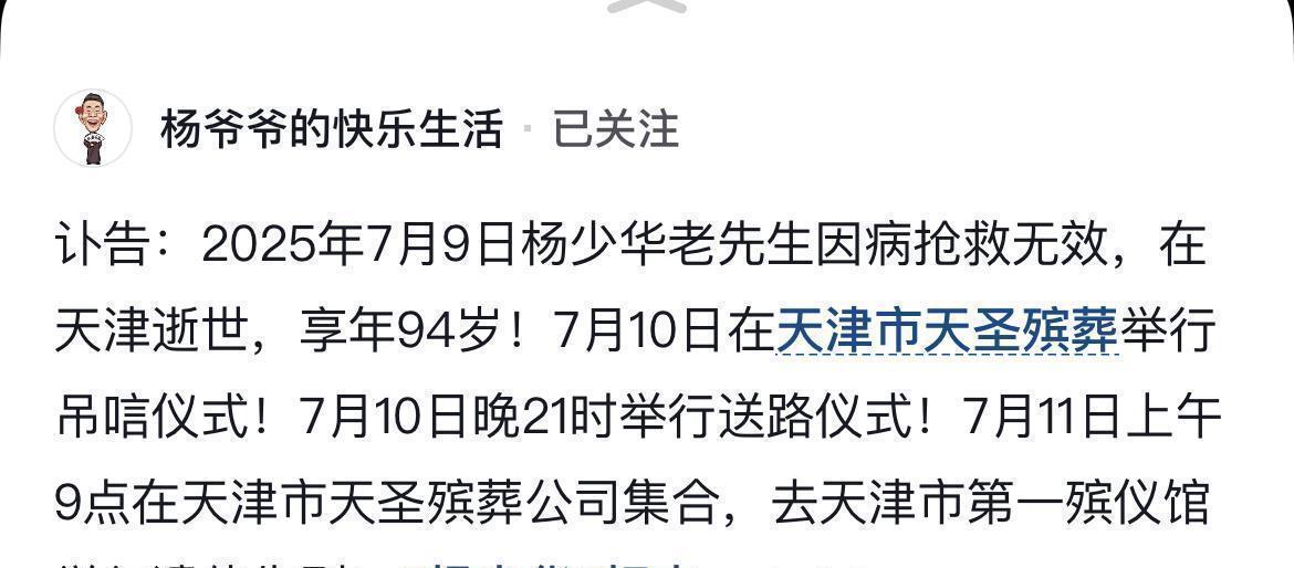 杨少华厌世那天,家里东说念主并莫得公布任何讣告,对于具体的情况也莫得显现,直到10号一大早,杨议、杨伦等东说念主才发布了留意的讣告,说老爷子因为生病抢救无果厌世,后续的安排会在两个处所进行。