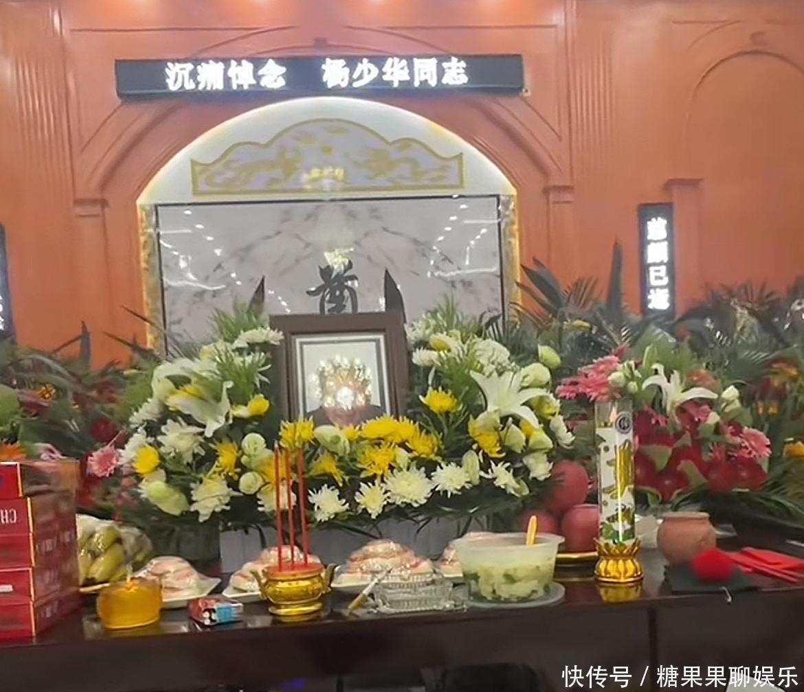 在曝光的灵堂像片里,杨少华老爷子的遗像被摆在一堆鲜花中间,独揽还堆满了多样花束,另外放着一些贡品。